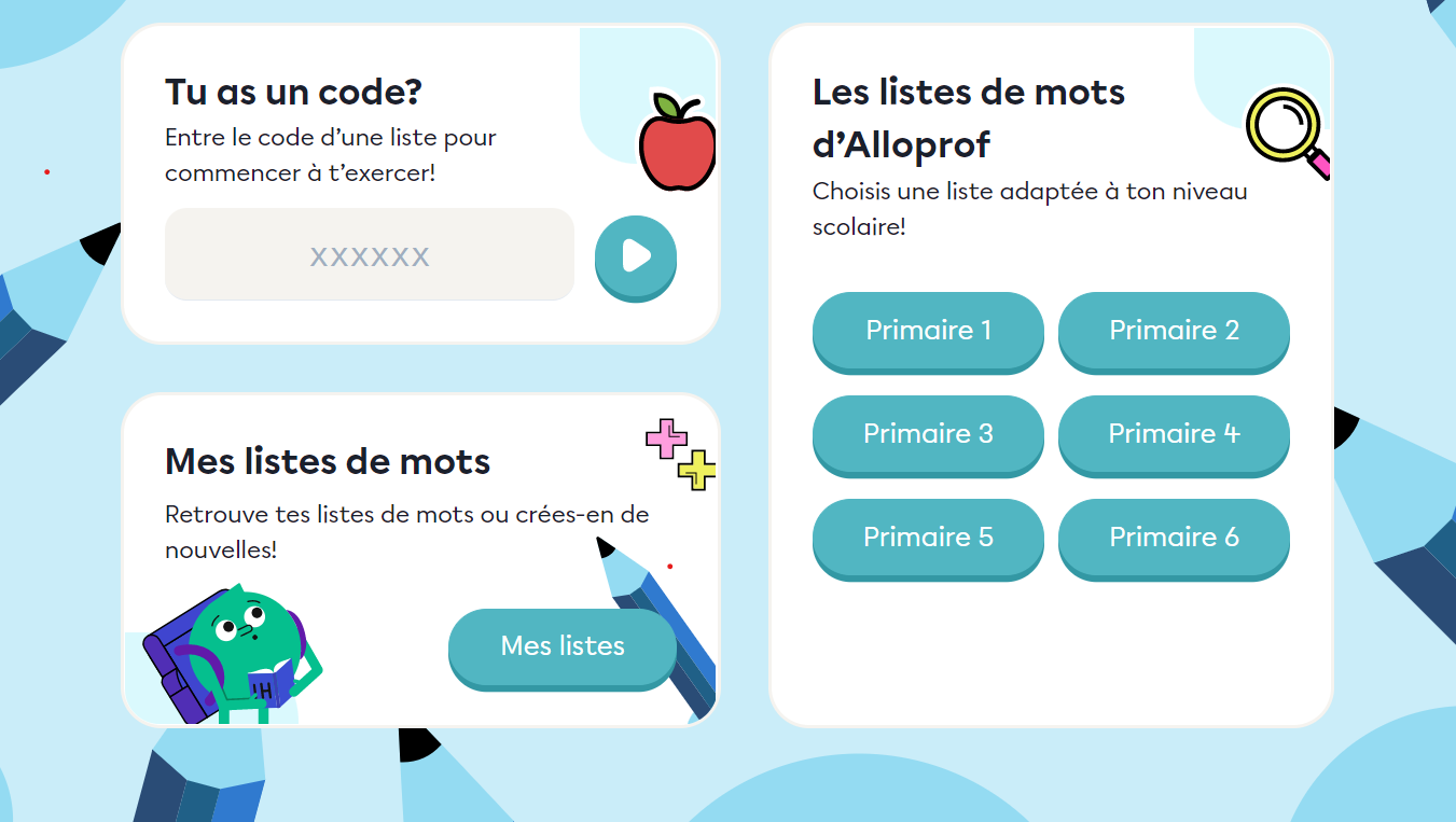Pour commencer, tu dois te rendre sur le site de l'exercice de vocabulaire. Clique sur commencer, puis clique sur la section «Mes listes» en bas à droite (comme sur la photo).