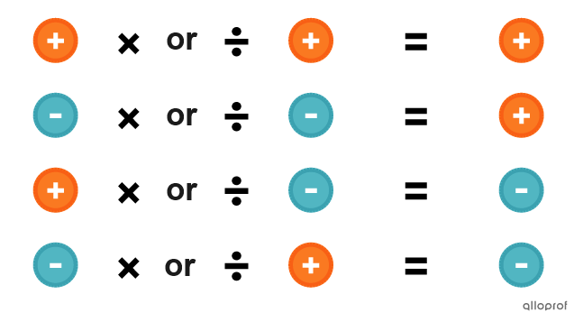 When you are doing multiplications and divisions, 2 positive numbers always give you a positive answer, 1 negative number and 1 positive number give you a negative answer and 2 negative numbers give you a positive answer.