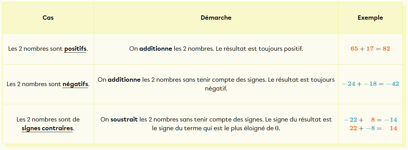 Il existe plusieurs approches pour comprendre l’addition de nombres positifs et négatifs. Différents cas sont possibles pour les opérations avec des nombres négatifs :