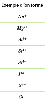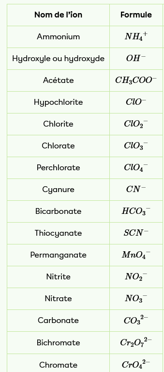 Voici des exemples de quelques ions fréquents lors de réactions chimiques.