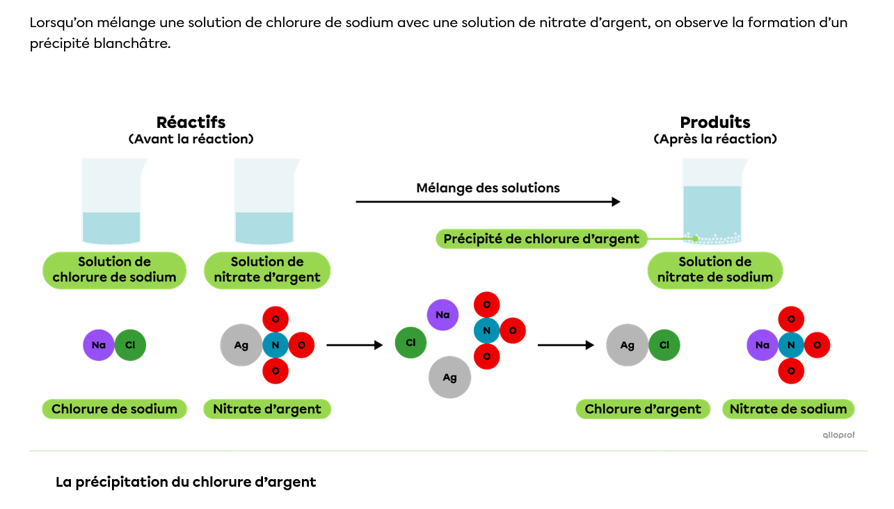 Une réaction de précipitation est une réaction chimique qui se produit lorsque deux substances en solution interagissent de manière à produire un solide peu ou non soluble appelé précipité.