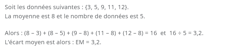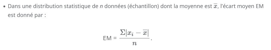 Ce qui est important de retenir est que l'écart type sera plus affecté (pourrait avoir un écart exagéré) quand il y a des données aberrantes. Dans ces cas l'écart moyen donne une meilleure représentation de la dispersion pour l'ensemble des données.