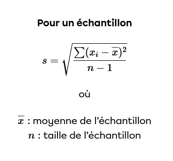 L’écart type, habituellement noté s lorsqu’on étudie un échantillon et σ lorsqu’on étudie une population, est une mesure de dispersion des données autour de la moyenne.