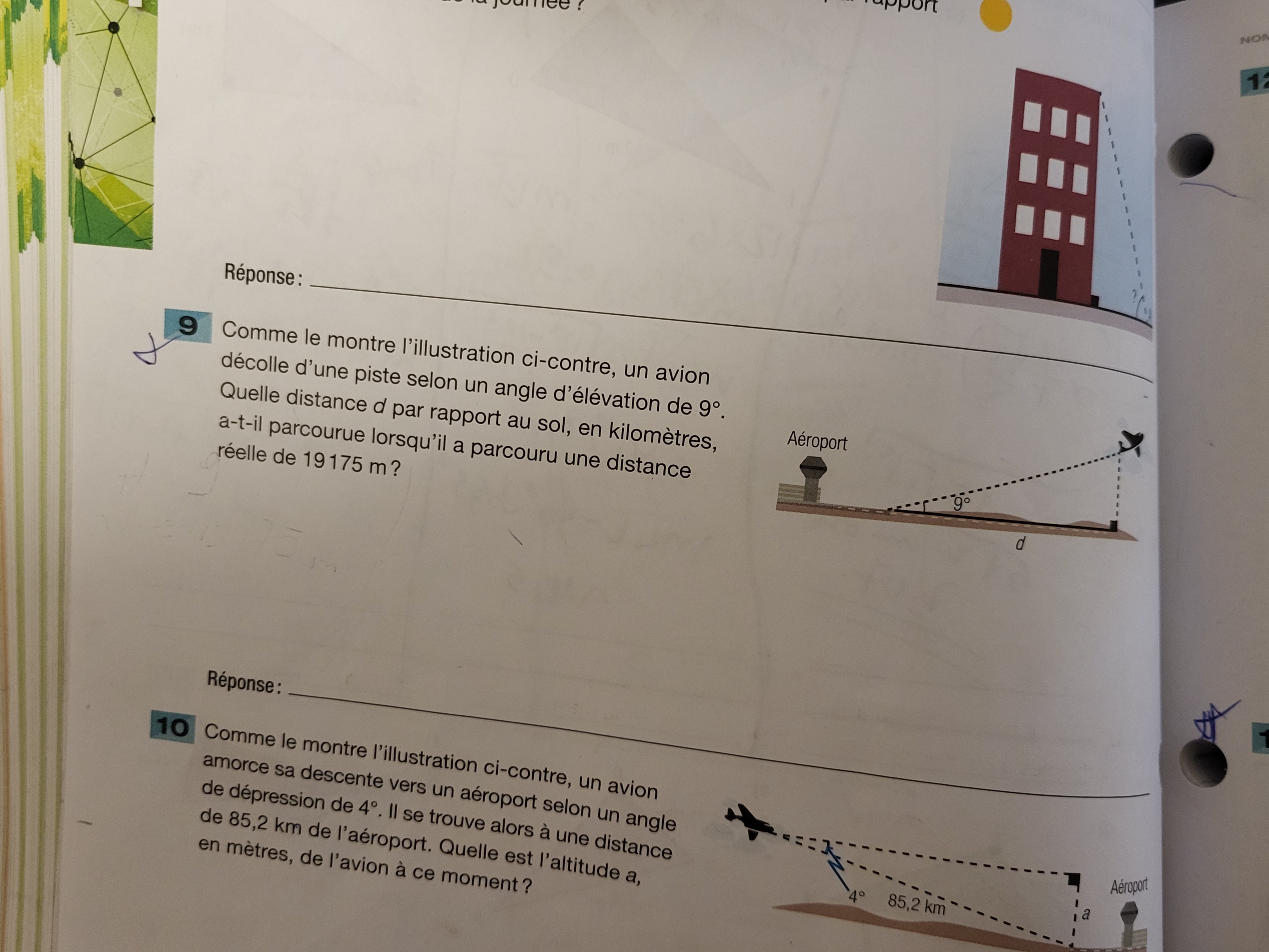 Ce qu'il faut comprendre dans ton exercice, c'est que tu as un triangle rectangle, on te donne la valeur de ton hypoténuse (la distance parcourue par l'avion) et on demande de trouver la mesure du côté adjacent à l'angle de 9 degrés.