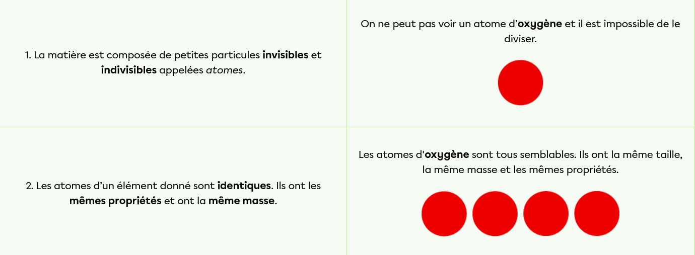 Le modèle atomique de Dalton représente les atomes par des boules de couleur et de grosseur différentes selon la nature de l'élément.