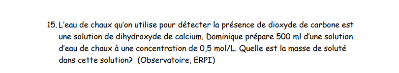Afin de répondre à cette question, tu devras procéder par étapes. Premièrement, tu devras transformer les ml en litres. Deuxièmement, tu devras trouver combien de moles de dihydroxyde de calcium tu auras. Troisièmement, à l’aide de la masse molaire et de sa formule, tu devrais être en mesure de trouver la masse.