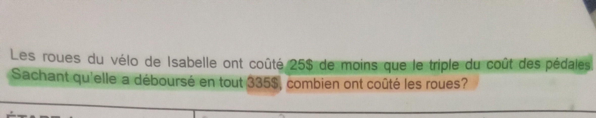 Ici, Isabelle a déboursé p pour ses pédales. Pour ses roues, elle a déboursé 3p - 25. Puisqu'elle a déboursé 335$ en tout, l'équation est p + 3p - 25 = 335