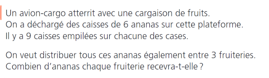 On nous dit que chaque case de la plateforme contient 9 caisses, et que chaque caisse contient 6 ananas. Donc, chaque case de la plateforme soutient 54 (9×6) ananas.