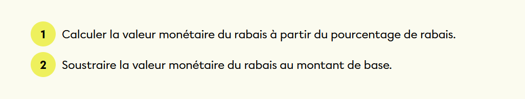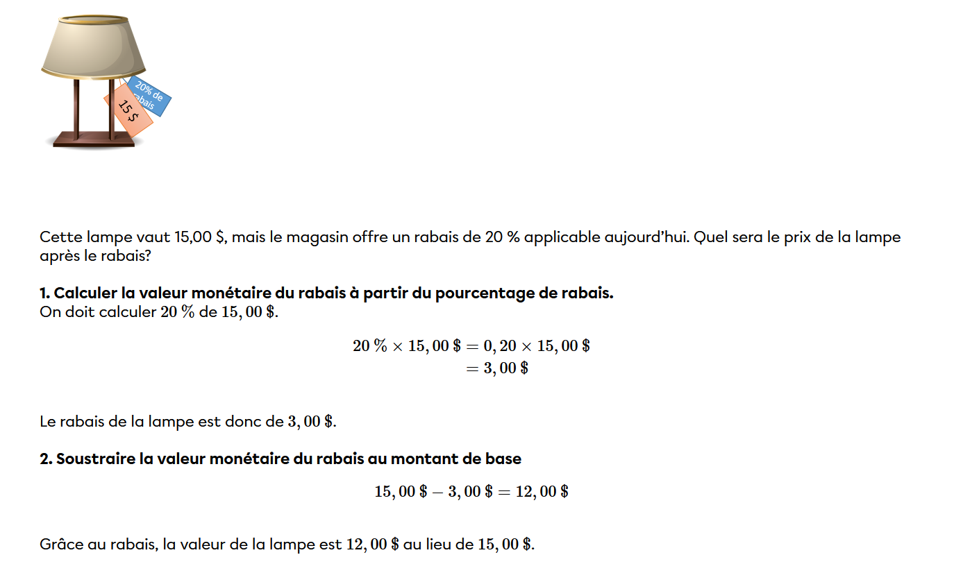 Le calcul d’un rabais se fait selon le même principe que celui utilisé pour calculer la taxe. Toutefois, plutôt que d’additionner un certain montant au prix de base, comme dans le cas des taxes, on doit réduire d’un certain montant la valeur de l’achat.