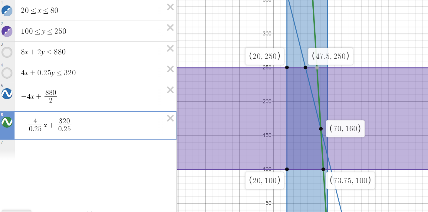 Nos sommets à évaluer sont donc (20, 250), (47,5 , 250), (70, 160), (73,75, 100) et (20, 100).