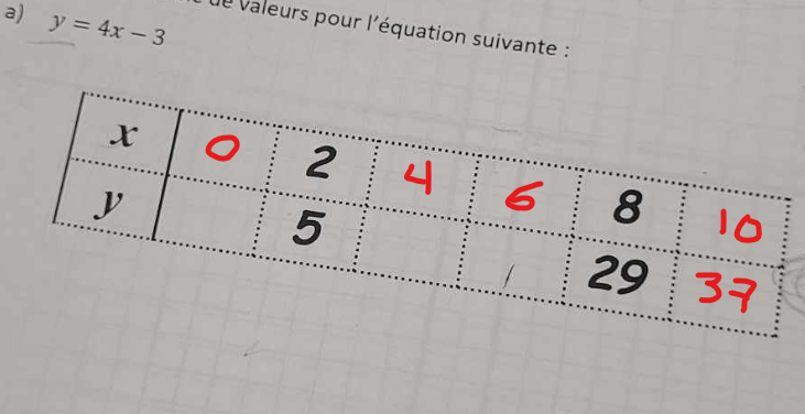 Puis, pour trouver le y correspondant à chacun de ces x, tu dois utiliser la règle \(y=4x-3\).