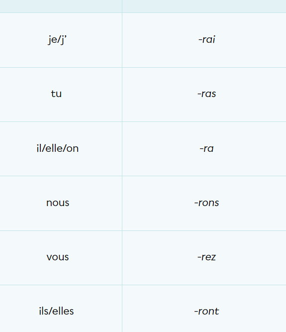 Le plus simple est d'apprendre les terminaisons, puisque plusieurs verbes partagent les mêmes terminaisons au futur simple. Cela signifie que lorsque tu les auras apprises, tu pourras conjuguer presque tous les verbes sans problème ! :D
