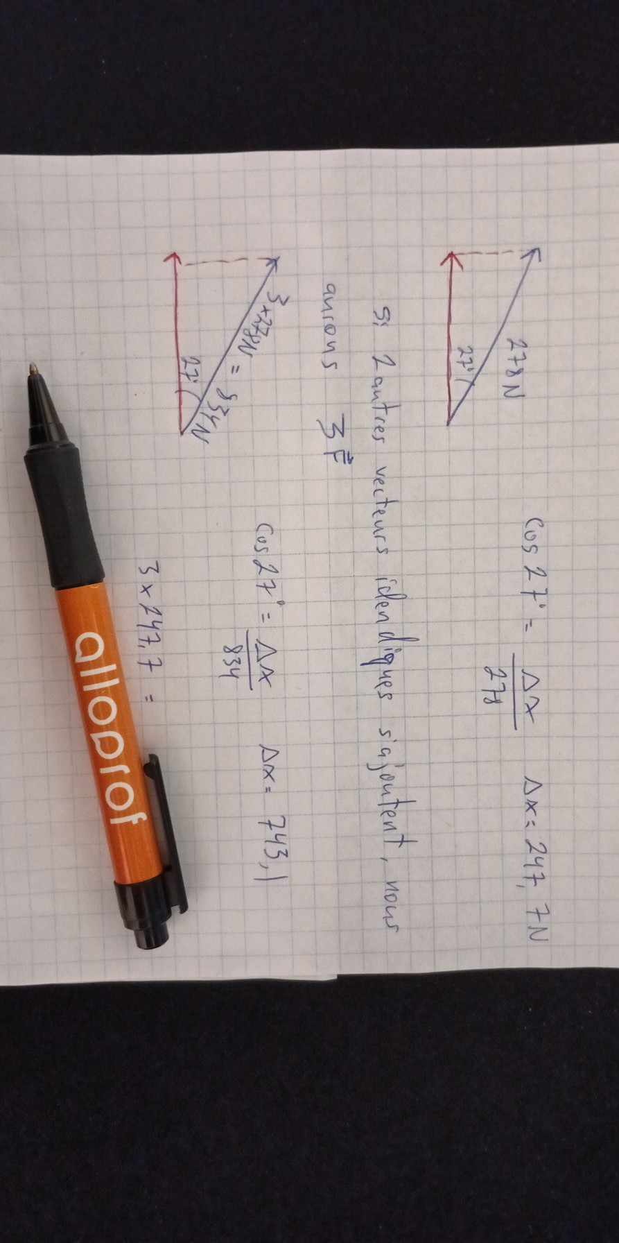 Recommence le même raisonnement que plus tôt, mais avec une norme de 834, tu auras un ∆x = 743,1 N, soit le triple de ton premier ∆x.