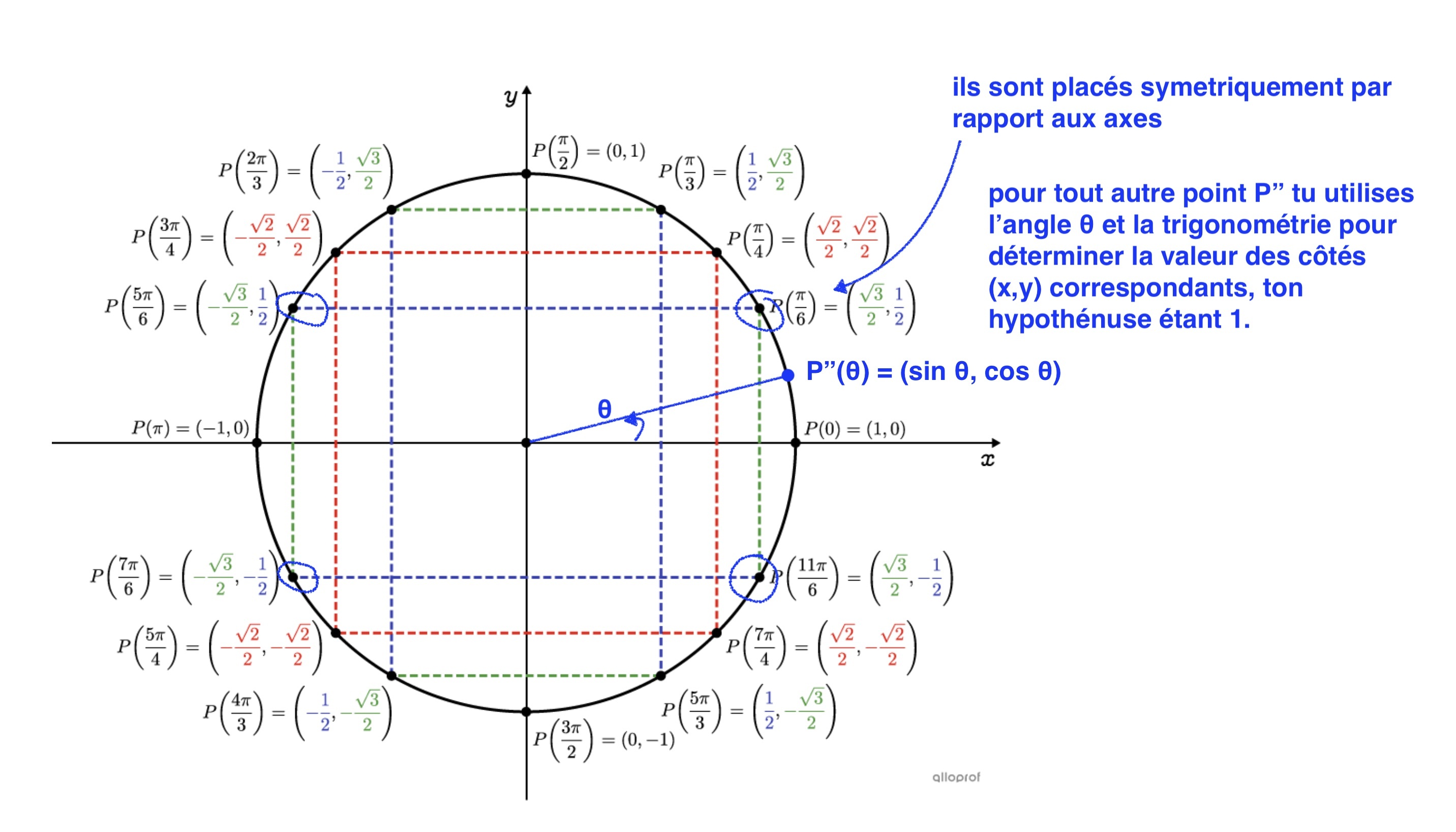 Dans un cercle trigonométrique, si j'ai un point ex: P(pi/6), comment je fais pour connaitre ceux qui ont la même image que lui? Aussi, comment je fais pour trouver des points trigonométriques qui correspondent au point donné?