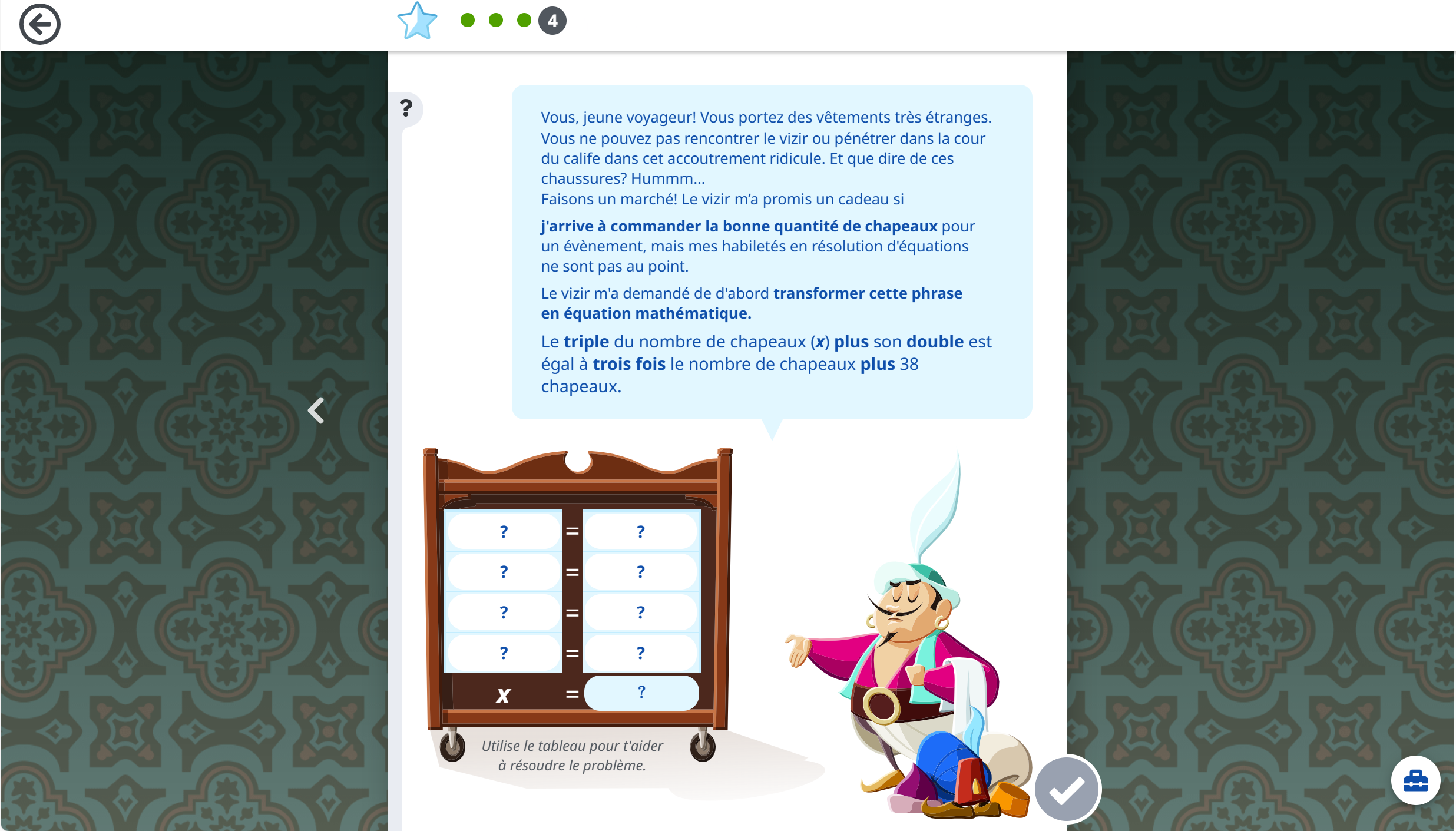 Concernant la question que tu as posée, pour résoudre à ce problème sur netmath, il faut que tu écrives la situation demandée sous la forme d'une équation mathématique et la résoudre. La lettre x représente le nombre de chapeaux. Il faut que tu mettes les bons chiffres qui multiplient la variable x et ensuite résoudre l'équation pour trouver la valeur de x.