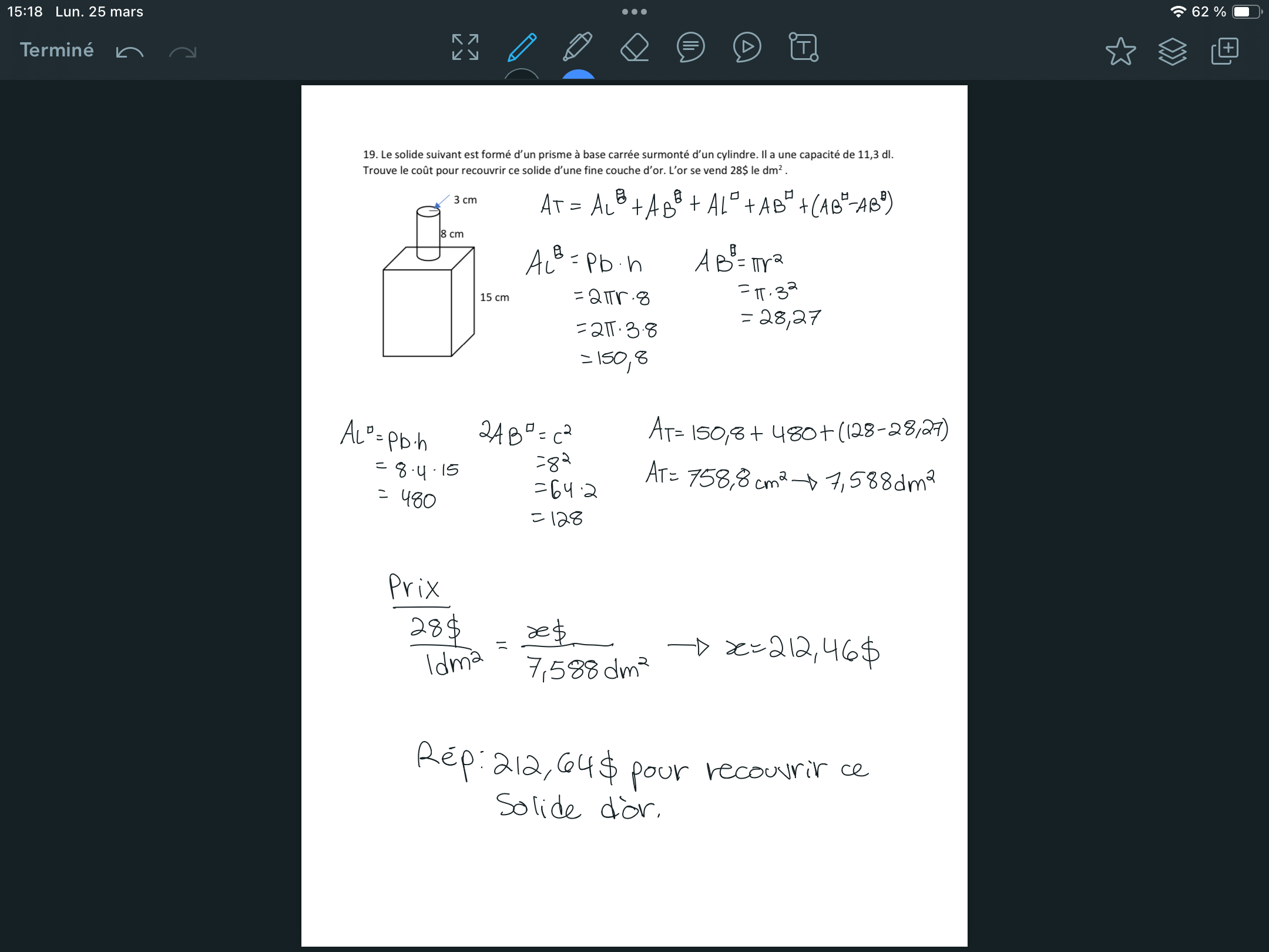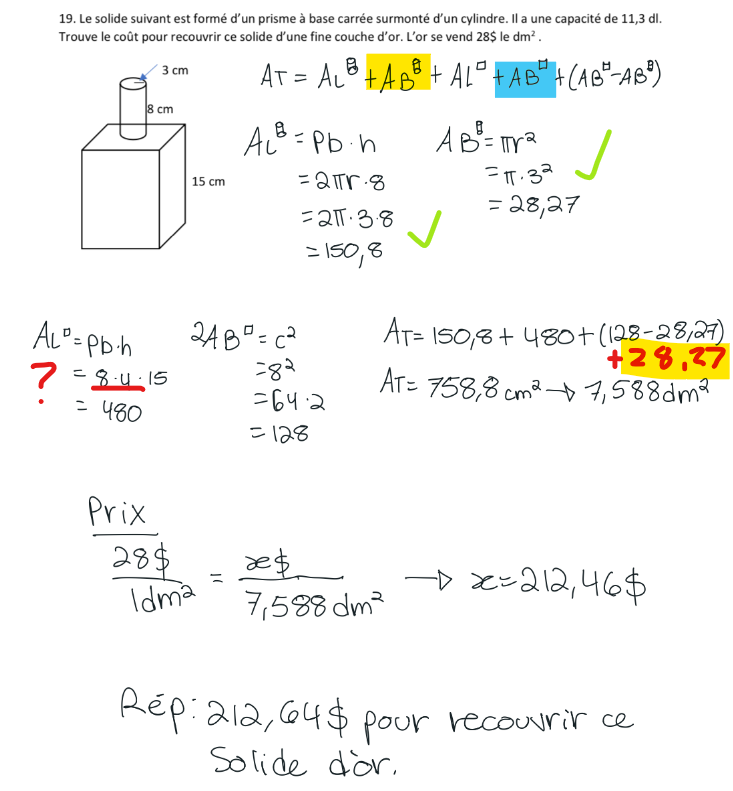 De plus, tu as oublié d'additionner l'aire de la base du cylindre et l'aire de la base du prisme dans l'aire totale.