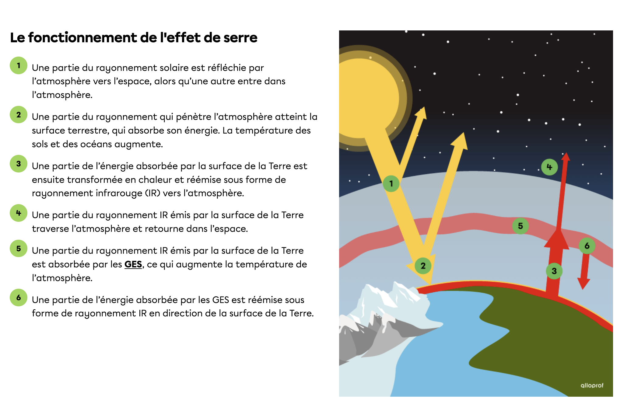 Donc, l'effet de serre est un phénomène naturel qui permet de retenir une plus grande partie de la chaleur des rayonnements solaires dans l'atmosphère, ce qui est essentiel à la vie sur Terre. L'effet de serre renforcé est l'intensification de ce phénomène à cause des GES produits par les humains. Trop de chaleur est alors retenue dans l'atmosphère, ce qui cause le réchauffement climatique et est globalement néfaste pour la vie sur Terre.