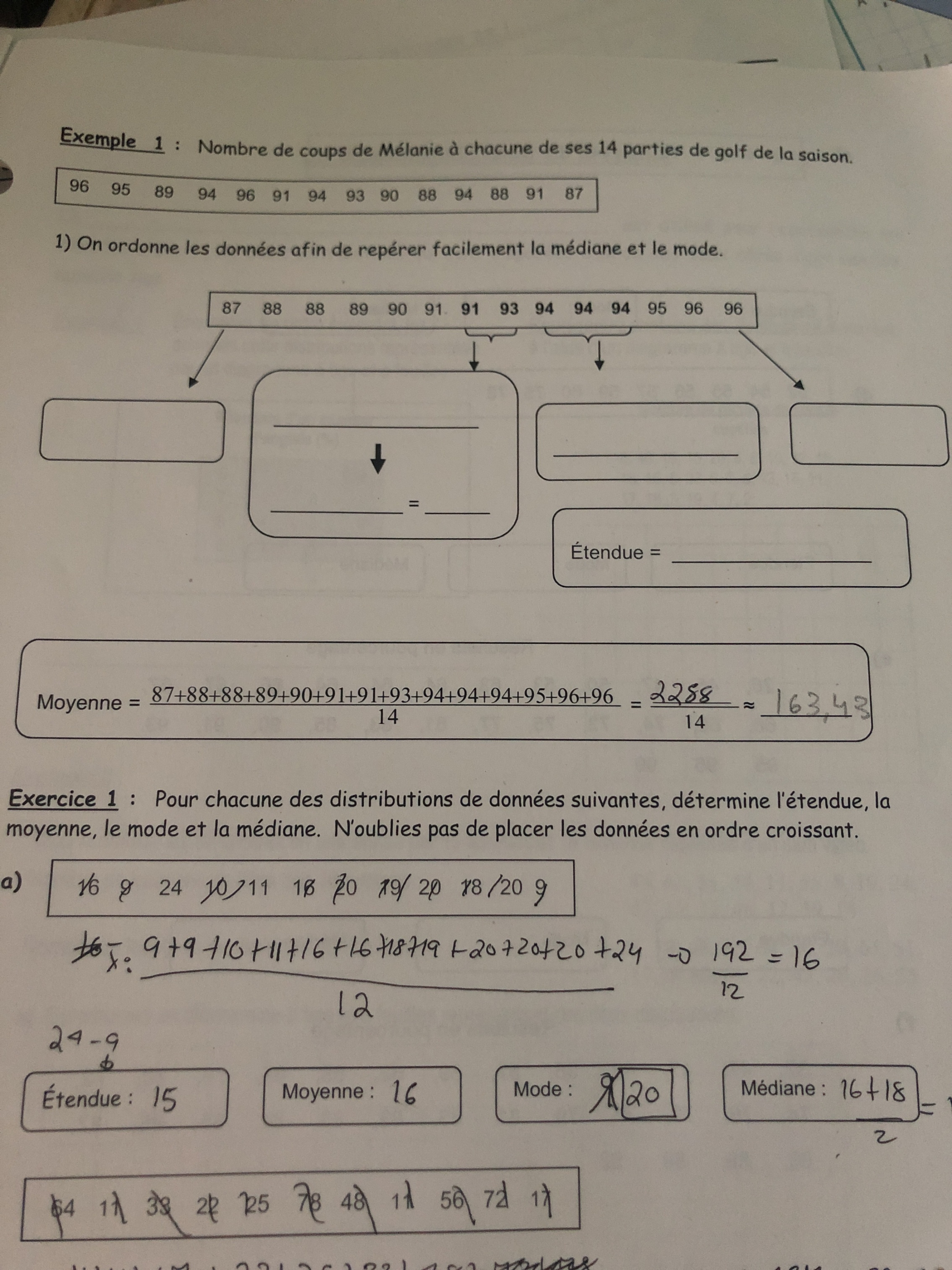 La médiane, c'est la donnée qui se trouve exactement au centre de la distribution. Ici, comme il n'y a oas de donnée exactement au centre, on doit faire une moyenne entre les deux, et donc la médiane sera 92.