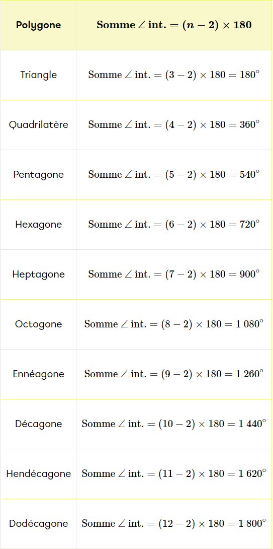 $$ \begin{align}\text{Somme}\ \angle \ \text{int.} &=(n-2) \times 180\\\\ \text{Somme}\ \angle \ \text{int.} &=180n-360\end{align} $$