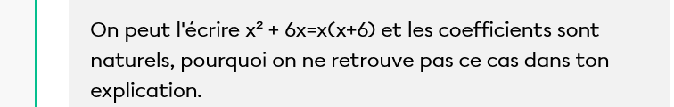 On peut l'écrire x² + 6x=x(x+6) et les coefficients sont naturels, pourquoi on ne retrouve pas ce cas dans ton explication.