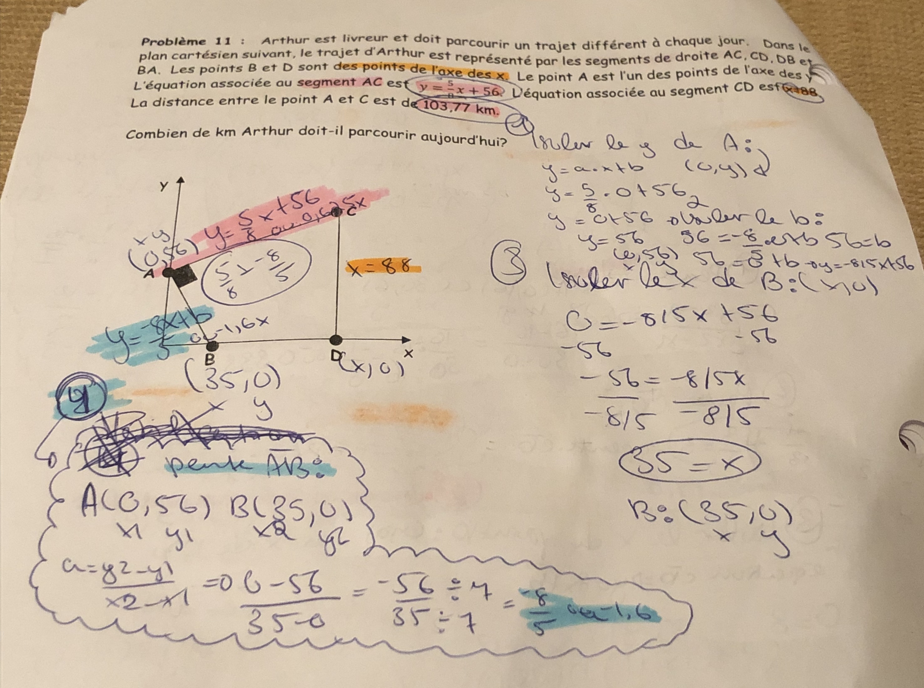 tu as déterminé la droite correspondant au segment AC: y = 5x/8 + 56 ; trouve le y du point C = (88,y) et tu auras la mesure qui te manque pour répondre à la question.