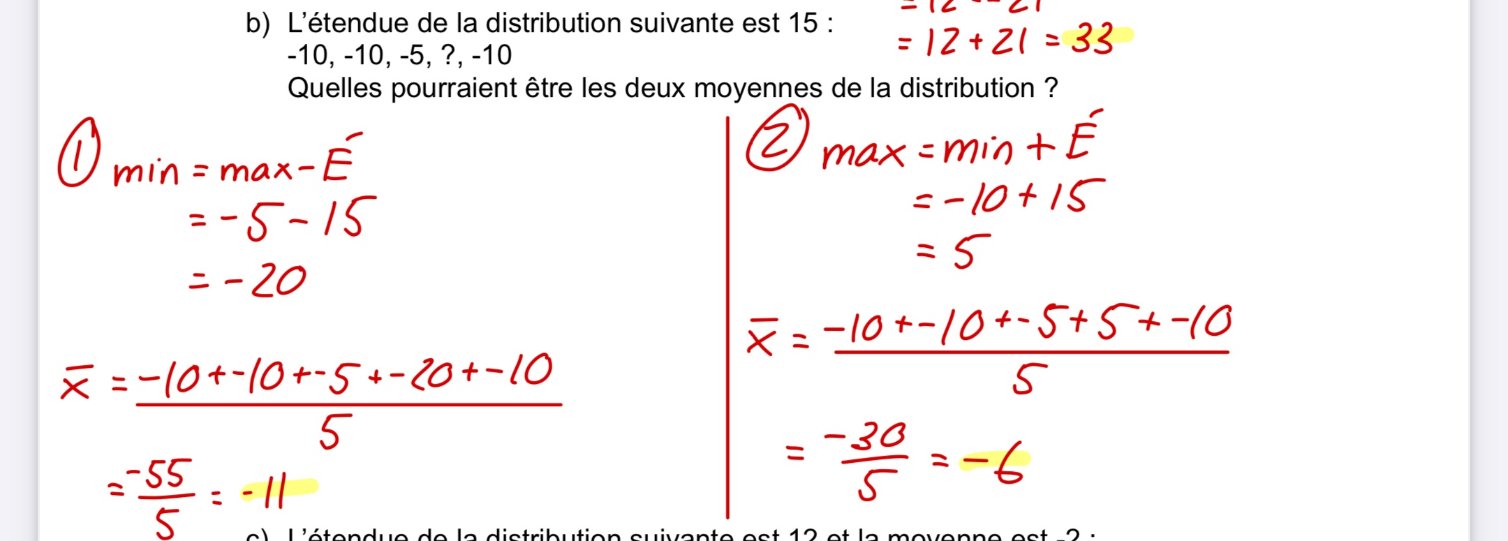 On a ainsi trouvé nos deux valeurs de ? qui permettent d'obtenir une étendue de 15. Il ne te reste plus qu'à trouver la moyenne de la distribution pour chacune de ces valeurs.