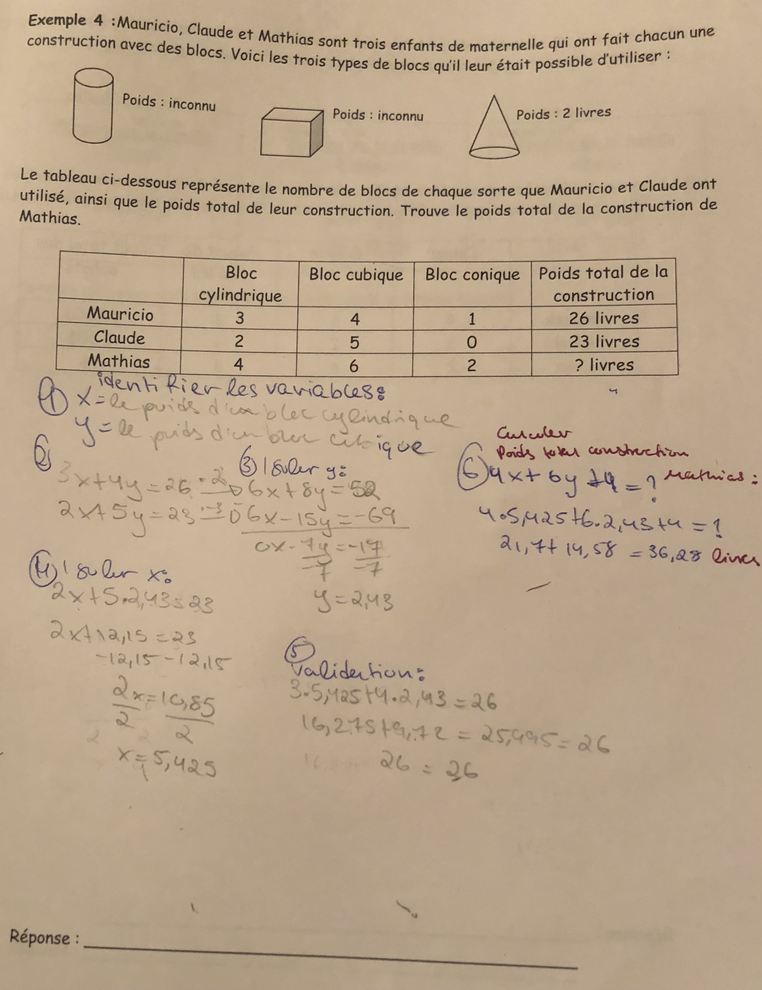 Ma réponse est-elle correcte? Merci ps: j’étais mélangée à cause du nombre de blocs coniques qu’il fallait rajouter dans les équations. J’ai trouvé 40,28 livres pour le poids total de la construction de Mathias. J’ai fait 4x+6y+4=?