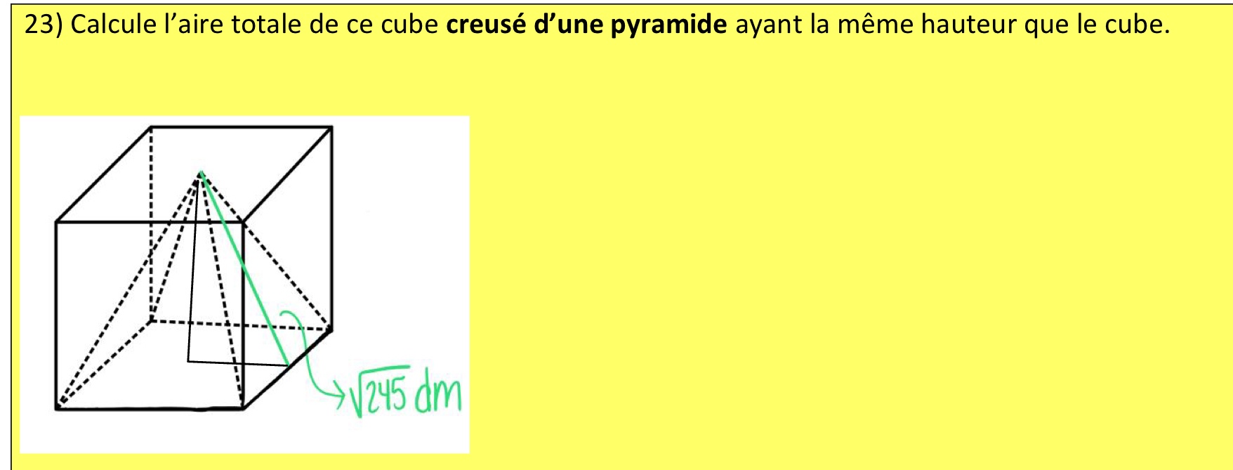 Tu dois calculer toute l'aire extérieure de l'objet: l'aire des 5 faces du cube + l'aire de la pyramide (les 4 côtés).
