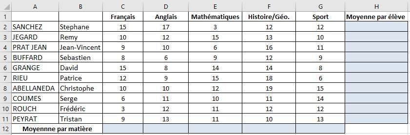 Calcule la moyenne de chaque élève. Puis la moyenne de chaque matière