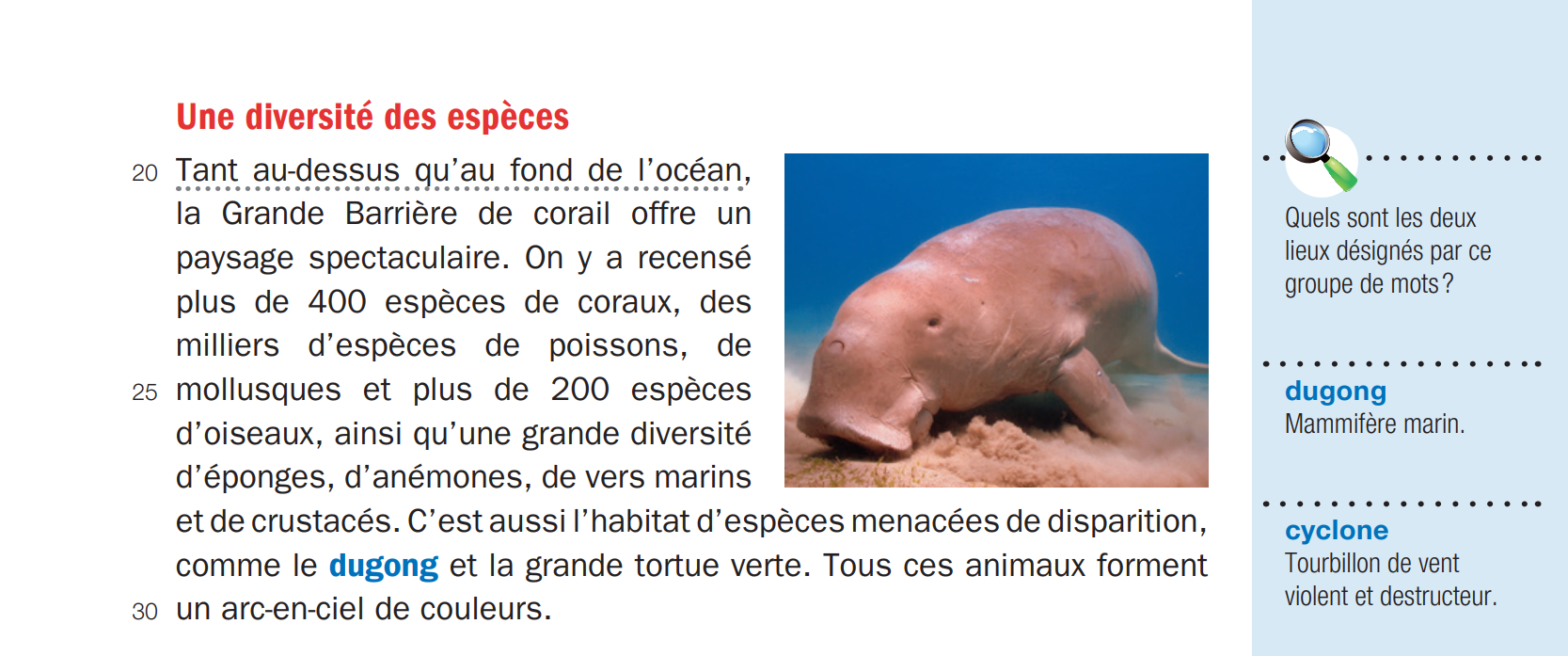On dit que la Grande Barrière de corail est aussi l'habitat de certains animaux qui sont menacés de disparition. Deux animaux qui vivent dans la Grande Barrière de corail et que sont menacés de disparition sont le dugong et la grande tortue verte. À gauche du texte, on voit justement une photo du gugong! :D