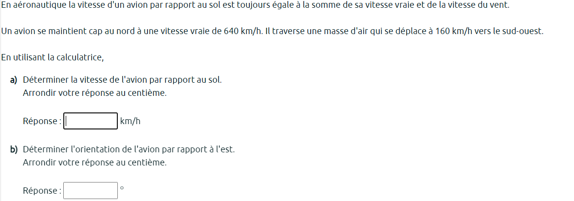 alors qu'en b) je donnerais l'angle de la vitesse résultante par rapport à l'Est (le β = 90º + θ)
