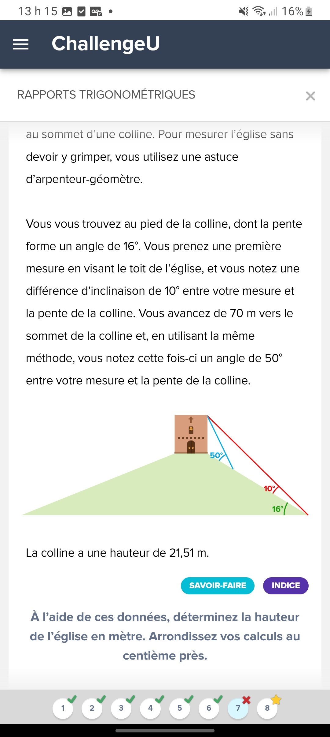 Ainsi, ton schéma n'est pas le bon, puisque tu as considéré que le 21,51 m est la hauteur de la colline ET de l'église, et non la hauteur de la colline uniquement. De plus, il est inutile de trouver la mesure de x dans ce problème.