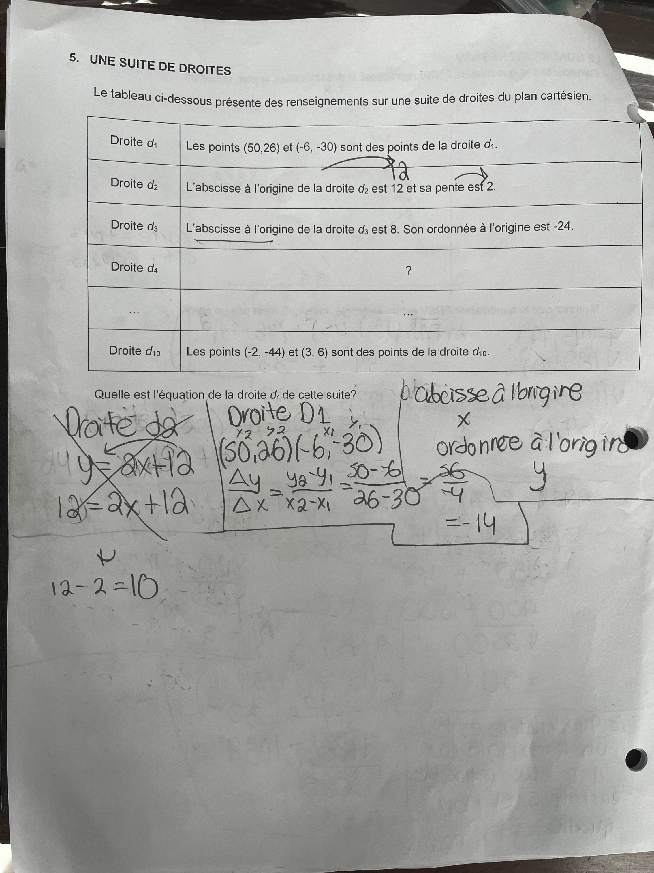 Pour le dernier problème, trouve la règle de chacune des trois premières droites et tu verras qu'il y a une progression qui te permettra de déterminer les droites subséquentes dont d10 (indice, le b ne change pas mais la pente oui).
