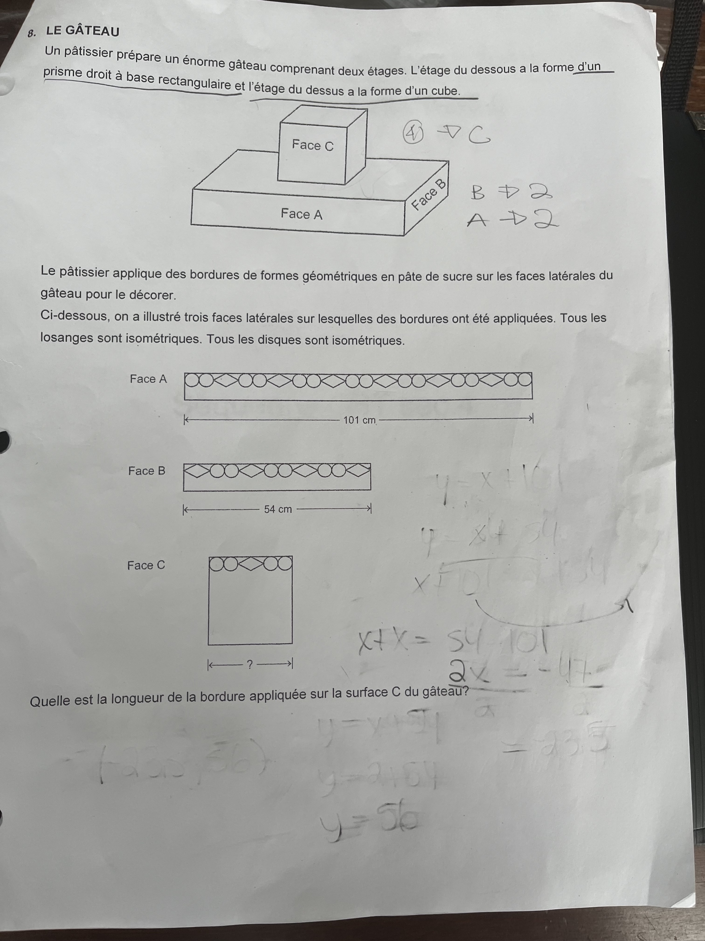 Tu résous pour trouver les dimensions (horizontales) de D et L et tu appliques à la décoration de la surface C qui est 4 ( nombre de disques + nombre de losanges) = ...