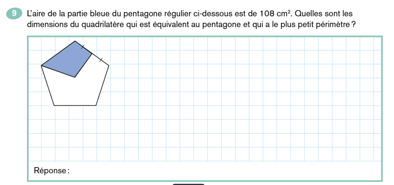 Ce problème concerne les aires équivalentes. Tu dois débuter en trouvant le périmètre du pentagone avec l'indice de l'aire de la partie bleue. Les petites barres sur le côté du haut signifie que ces deux sections sont de longueur égale. Je te suggère de lire la fiche suivante dans laquelle il y a beaucoup d'exemple pour te guider