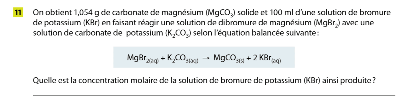 Tu peux tout d'abord convertir la masse de MgCO3 produite en nombre de moles grâce à n = m/M. Ensuite, grâce à un rapport de proportion, tu peux déterminer le nombre de moles (n) de KBr produite (1 mole de MgCO3 produite correspond à 2 moles de KBr produite, en te fiant aux coefficients).