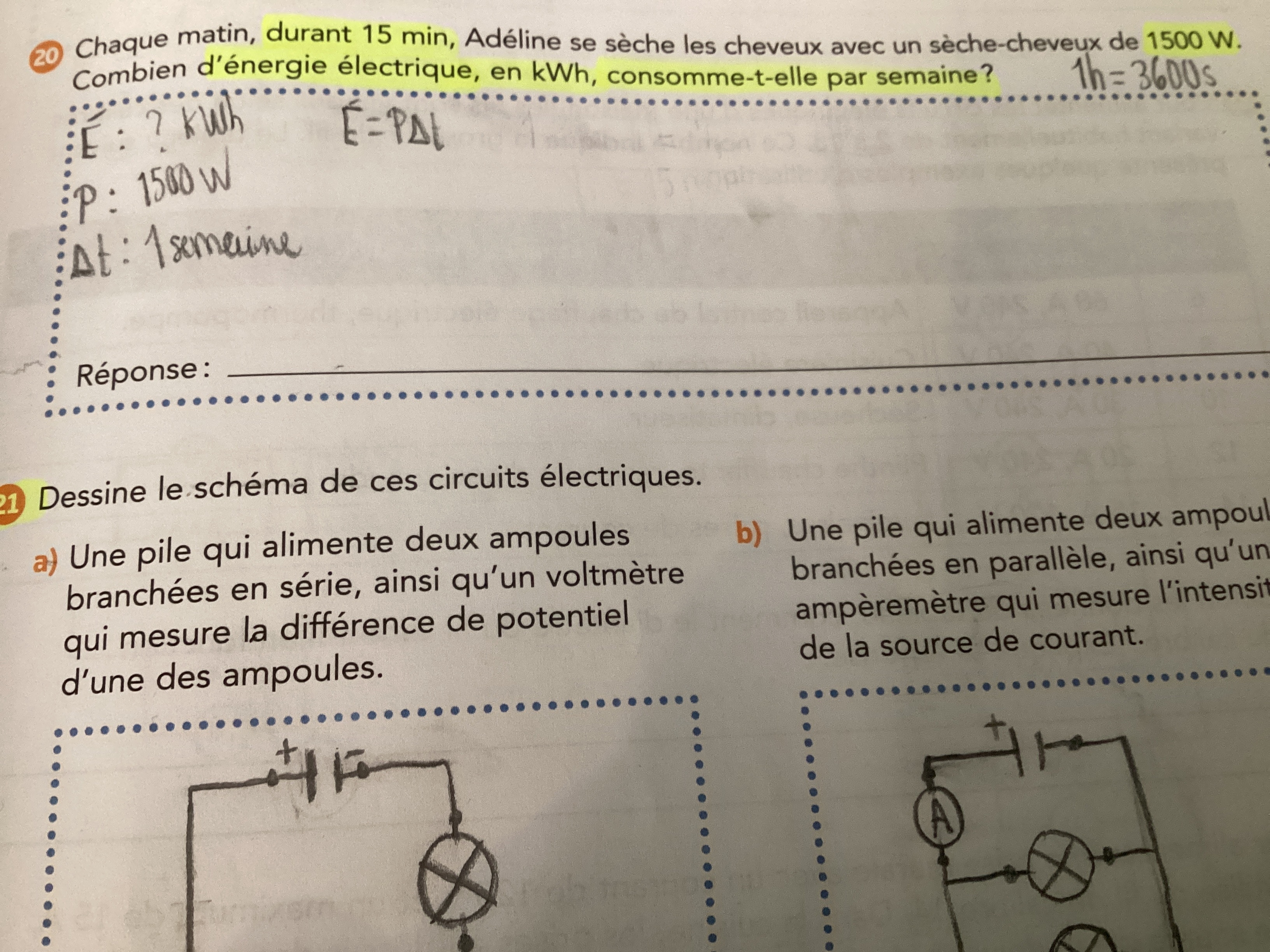 Si Adéline se sèche les cheveux durant 15 minutes à chaque jour de la semaine, combien de temps se sèchera-t-elle les cheveux au total durant la semaine? La réponse à cette question deviendra ton Δt. N'oublie pas de la convertir en heures pour obtenir les unités souhaitées pour le É.