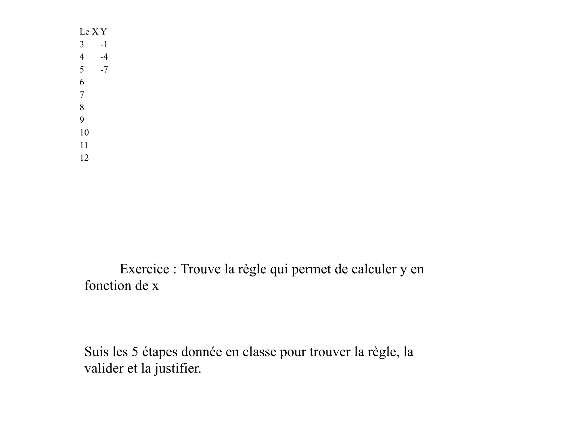 Je peux te pister en te demandant si à chaque fois que tu multiplies la valeur de x par -3, tu obtiens la valeur de y? Tu as peut-être quelque chose à ajouter ou à enlever pour l'obtenir?