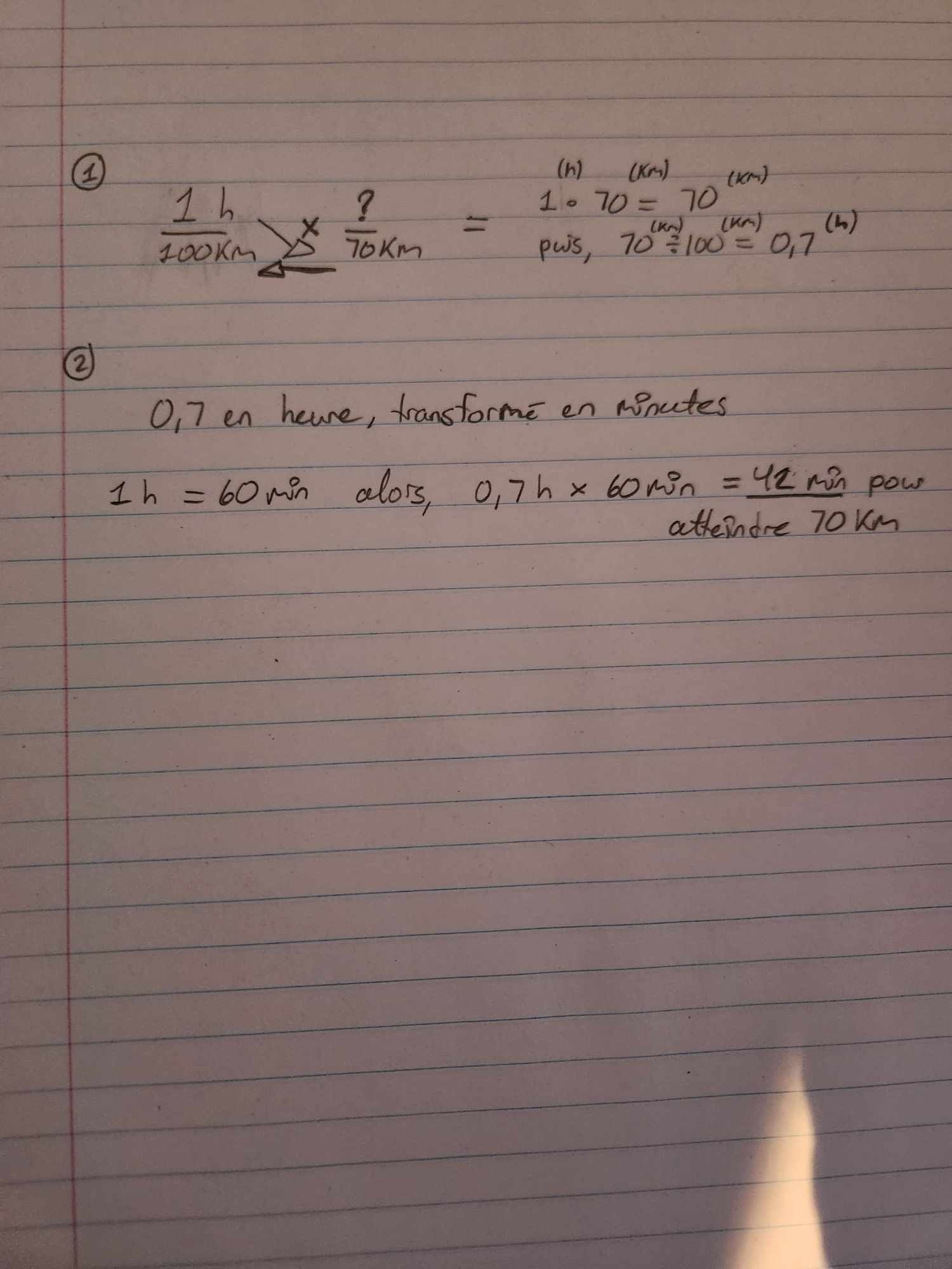 0,7 (heure) X 60 (minutes) = 42 minutes pour conduire les 70km