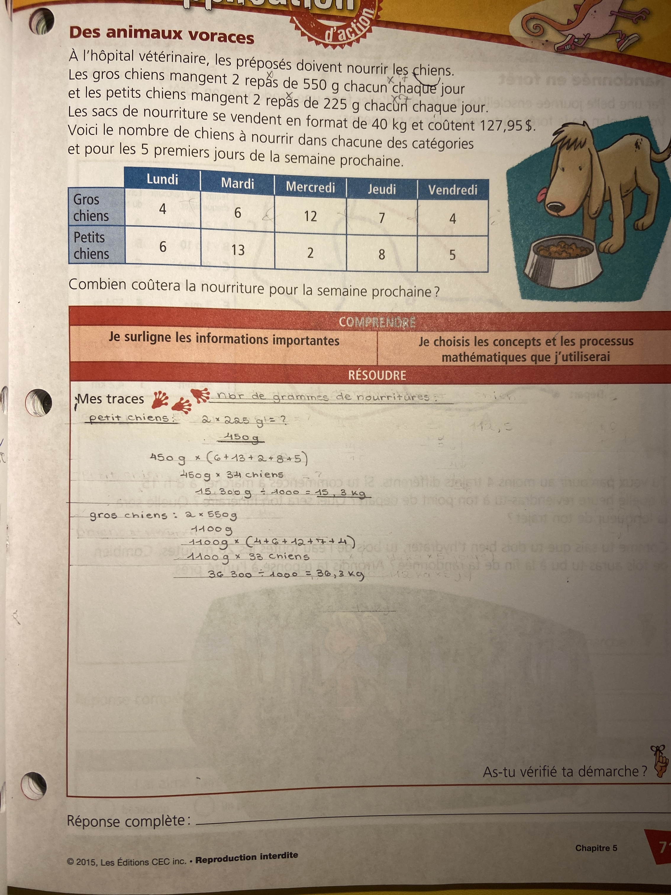 Par la suite, tu pourras déterminer si tu devras acheter combien de sacs de 40 kg de nourriture. Puis, sachant qu’un sac coute 127,99$, tu pourras trouver le prix total.