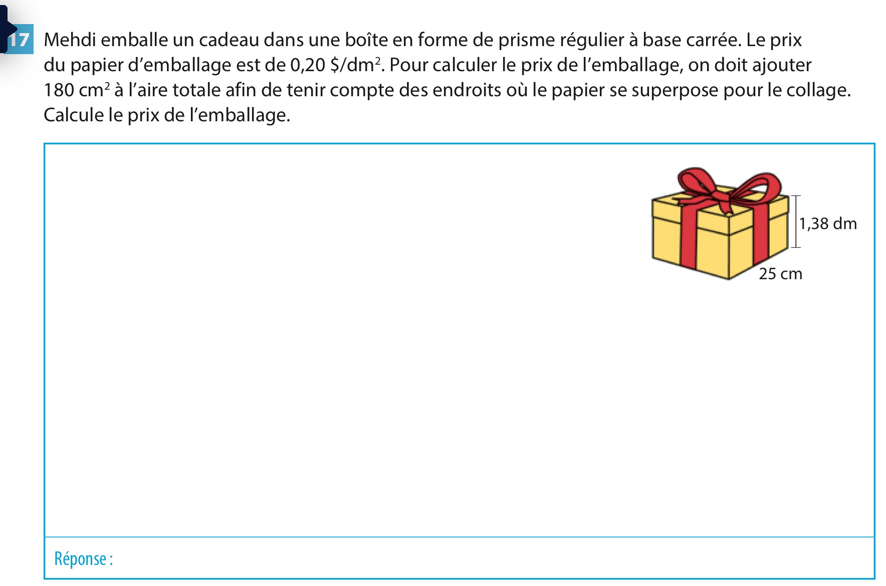 J'ai fait votre problème de Mathématique et je pense avoir trouvé la bonne réponse, même si je n'en suis pas si sûre que ça. Vous devrez commencer par trouvé l'air de votre cadeau en dm2. Après, vous devrez ajouter le 180 cm2 en dm2. Puis pour terminer, vous devrez diviser par 0.2 votre chiffre. Cela m'a donné, avec toutes les étapes, 107,25$. Bonne journée!