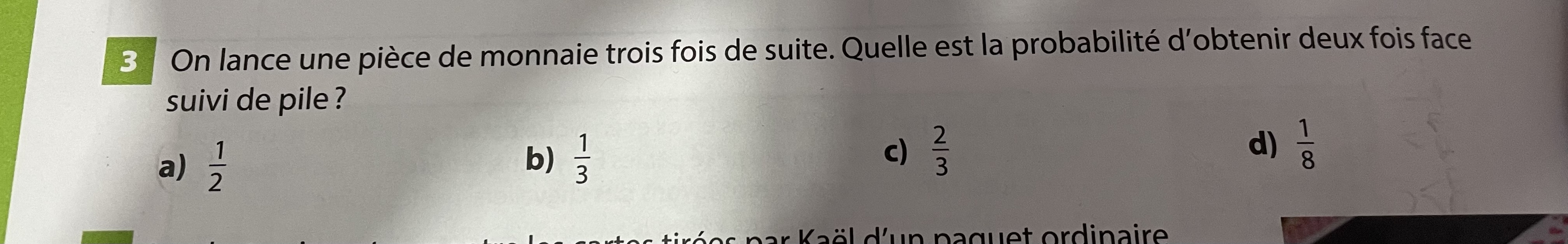 La probabilité d'obtenir deux fois face suivi de pile correspond donc à: