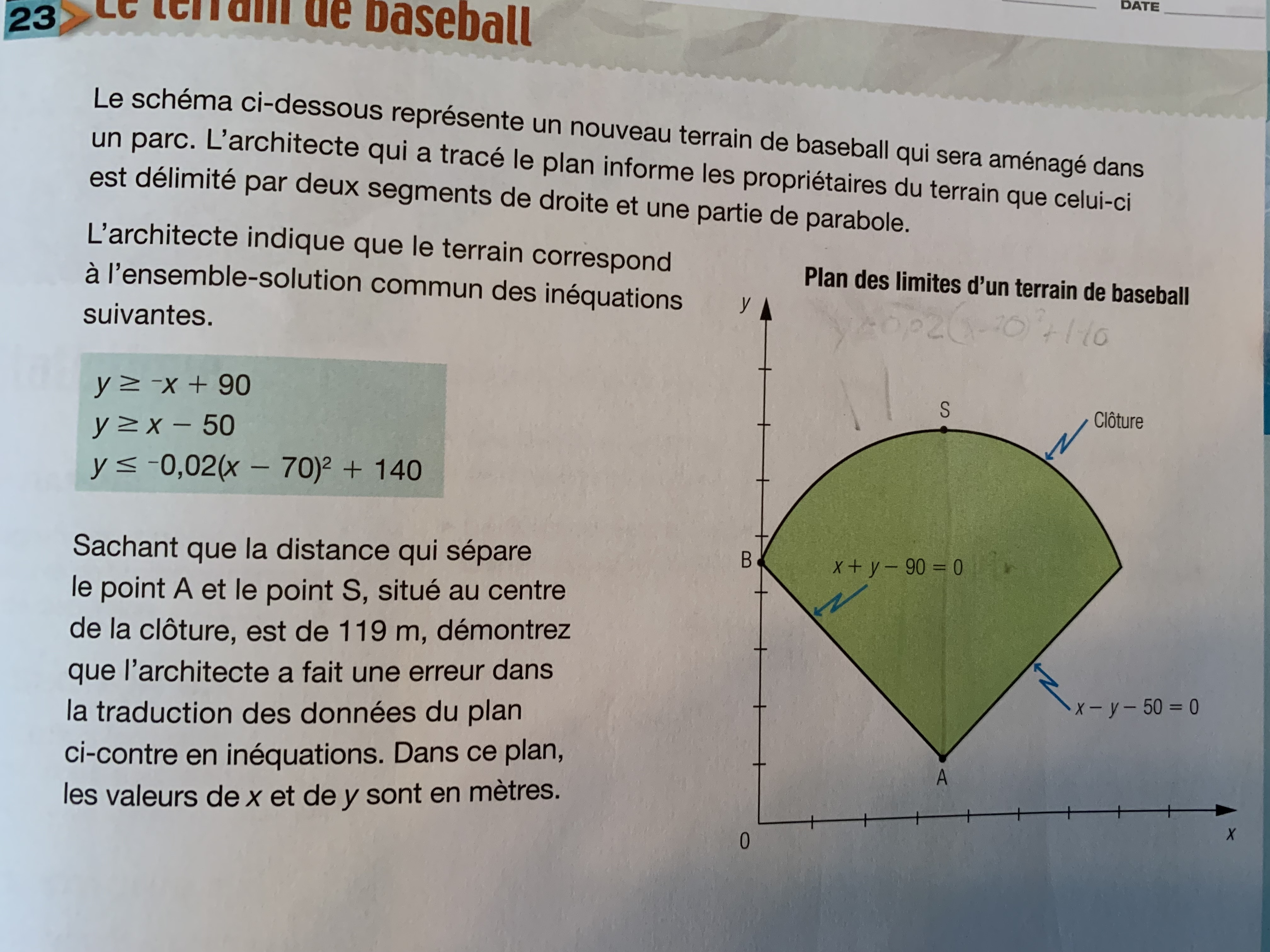 Tu dois trouver la distance entre le point S et le point A, et démontrer qu'elle n'est pas égale à 119 m, ce qui prouvera ainsi que les inéquations de l'architecte ne sont pas les bonnes puisqu'elles ne permettent pas d'avoir une distance de 119 m entre le point A et le point S.