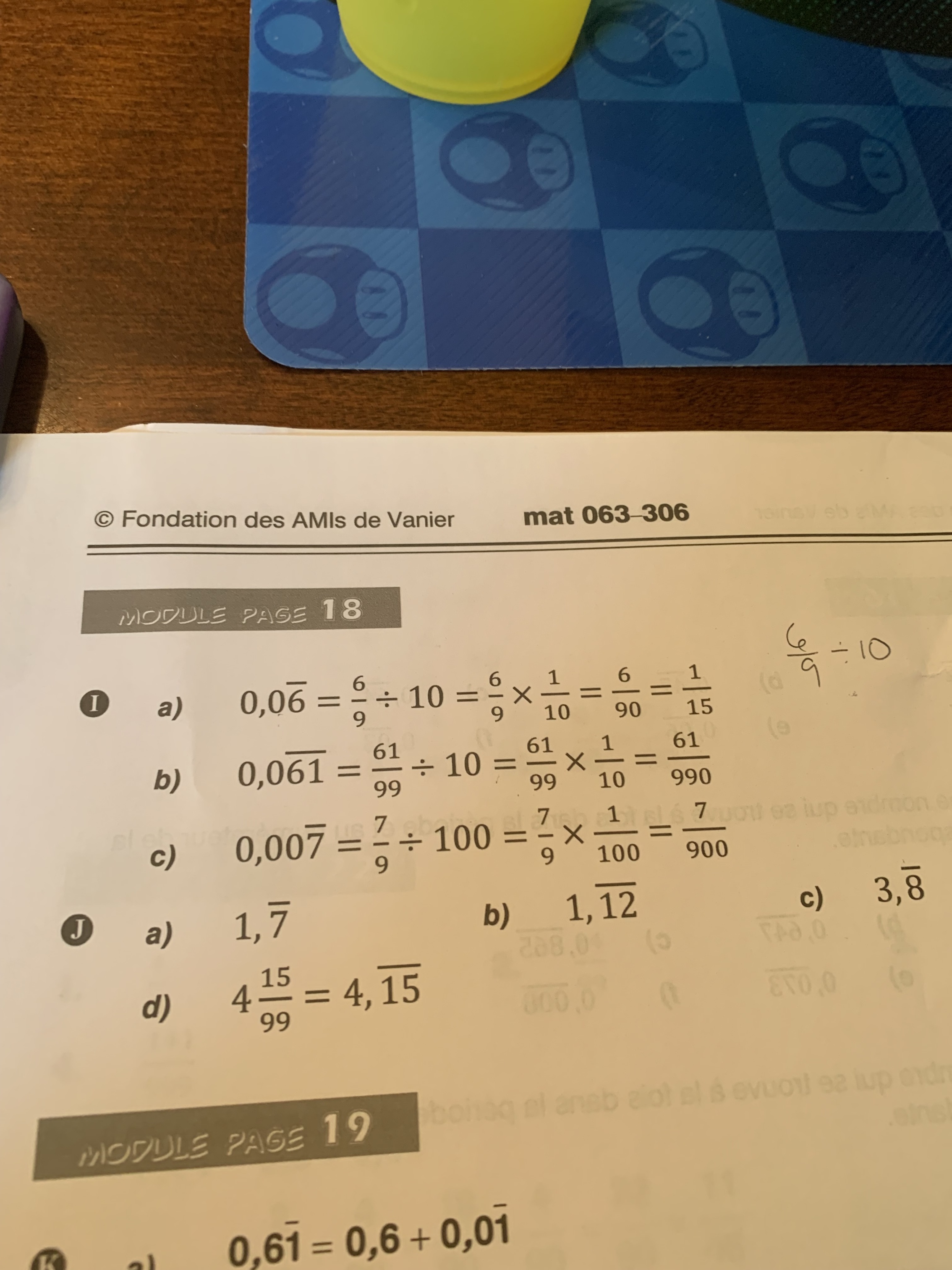 3) Dans le développement décimal, trouve le nombre de zéros devant la partie périodique. Cela te permettra de déterminer le multiple de 10 par lequel tu dois diviser. Par exemple, en a) et b), il y a 1 zéro devant les 6, donc on divise par 10. En c), il y a 2 zéros, donc on divise par 100. S'il y avait 3 zéros, on diviserait par 1000. Etc.