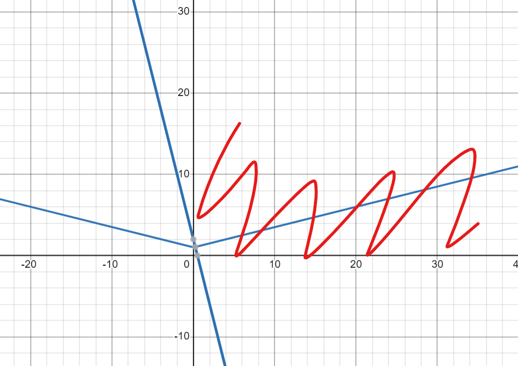 quand la droite est décroissant et la valeur absolue est vers le haut, quand la fct valeur absolue est plus grand c'est tout le temps a droite