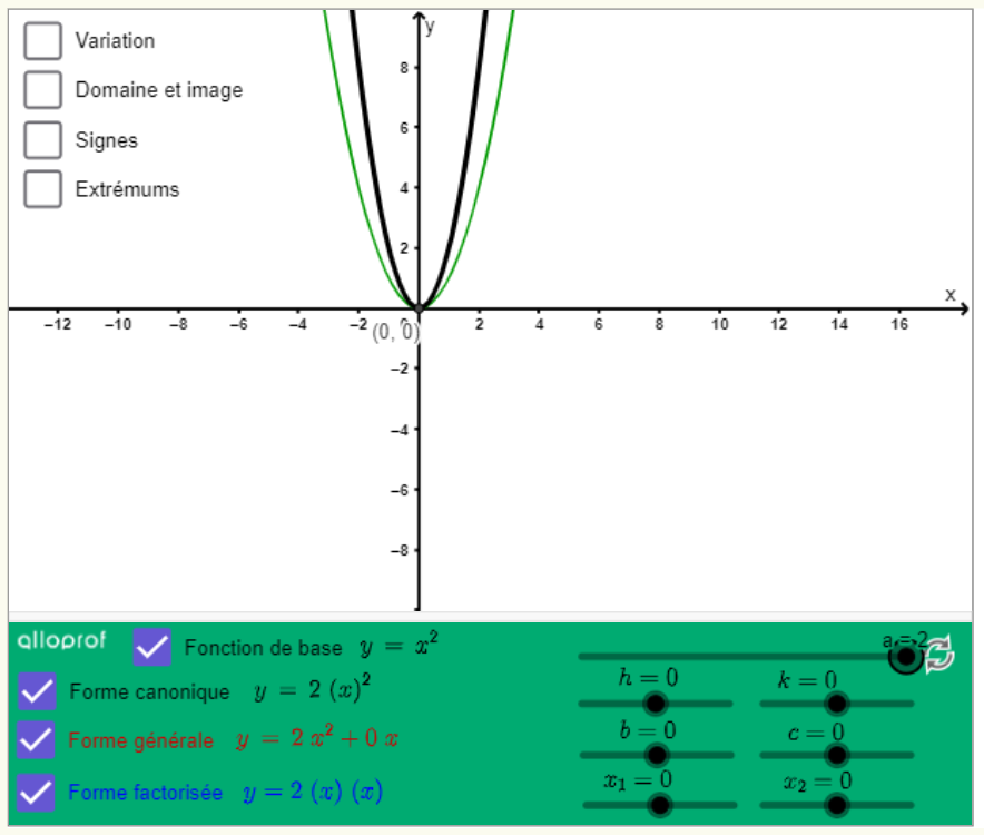 Dans les deux cas, ton sommet est à (0,0) , il n'y a eu aucune translation, il ne reste que le paramètre a qui peut avoir été modifié. Ceci a du sens étant donné que ce paramètre contrôle la 'pente' de ta quadratique (concrètement à quel point elle est ouverte ou fermée)
