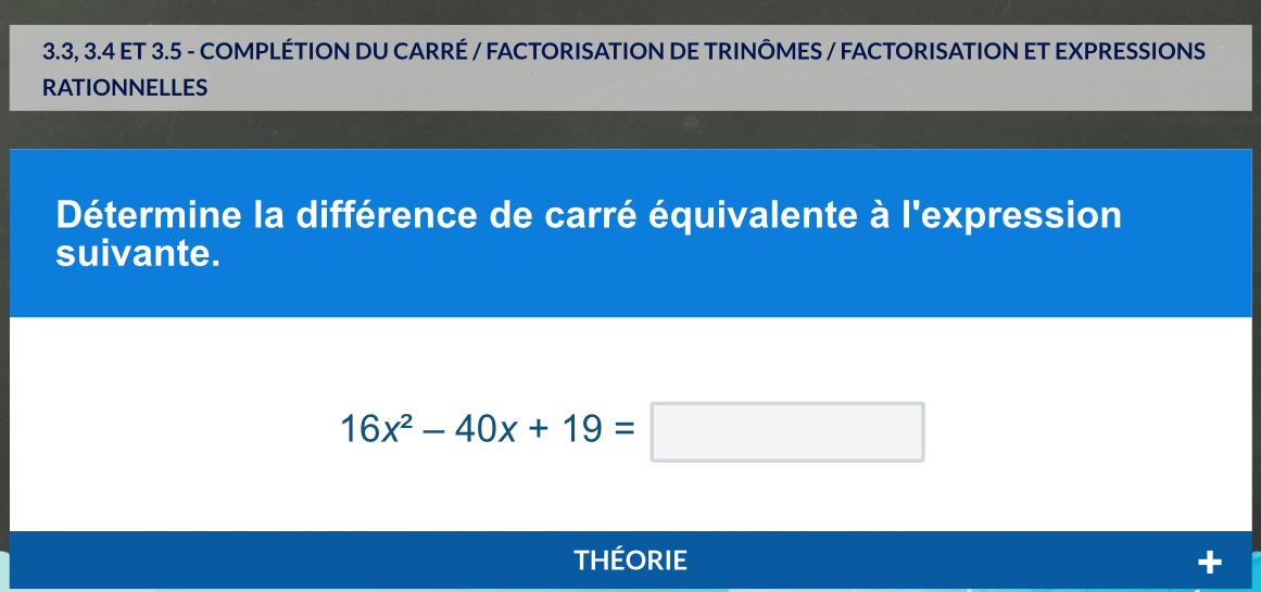 Pour trouver une différence de carrés équivalente à l'expression initiale, tu dois effectuer une complétion du carré.