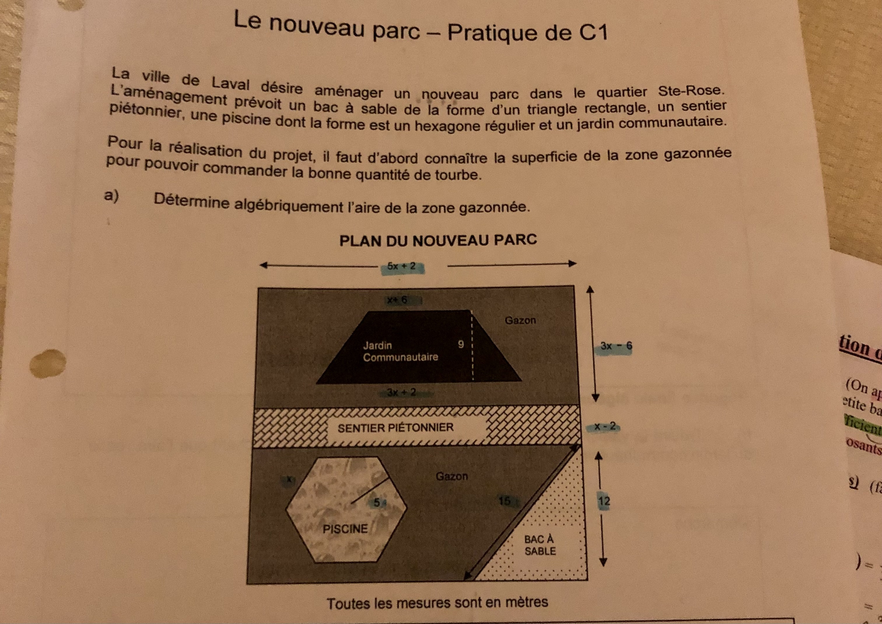 Donc, ta mission est de savoir l'aire en expression algébrique de l'aire du gazon, c'est-à-dire toute la surface du terrain moins l'aire de la piscine, du bac à sable, du sentier piétonnier et du jardin communautaire.