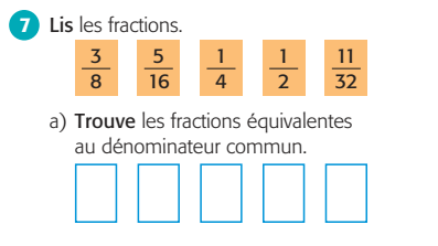 Oui, c'est ça! ;) On te demande de trouver le dénominateur commun des fractions orange. Le dénominateur commun de 8, 16, 4, 2 et 32 est 32. Ensuite, tu dois transformer chacune des fractions orange en une fraction équivalente dont le dénominateur est 32. Donc, 3/8 devient 12/32, 5/16 devient ?/32, 1/4 devient ?/32, etc.