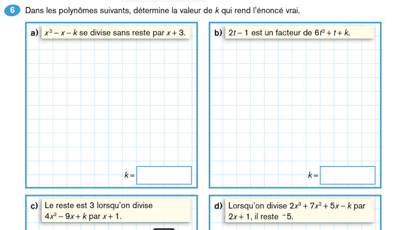 En résolvant l'équation en bleue, tu pourras trouver la valeur de k qui nous permet d'avoir un reste de 0.